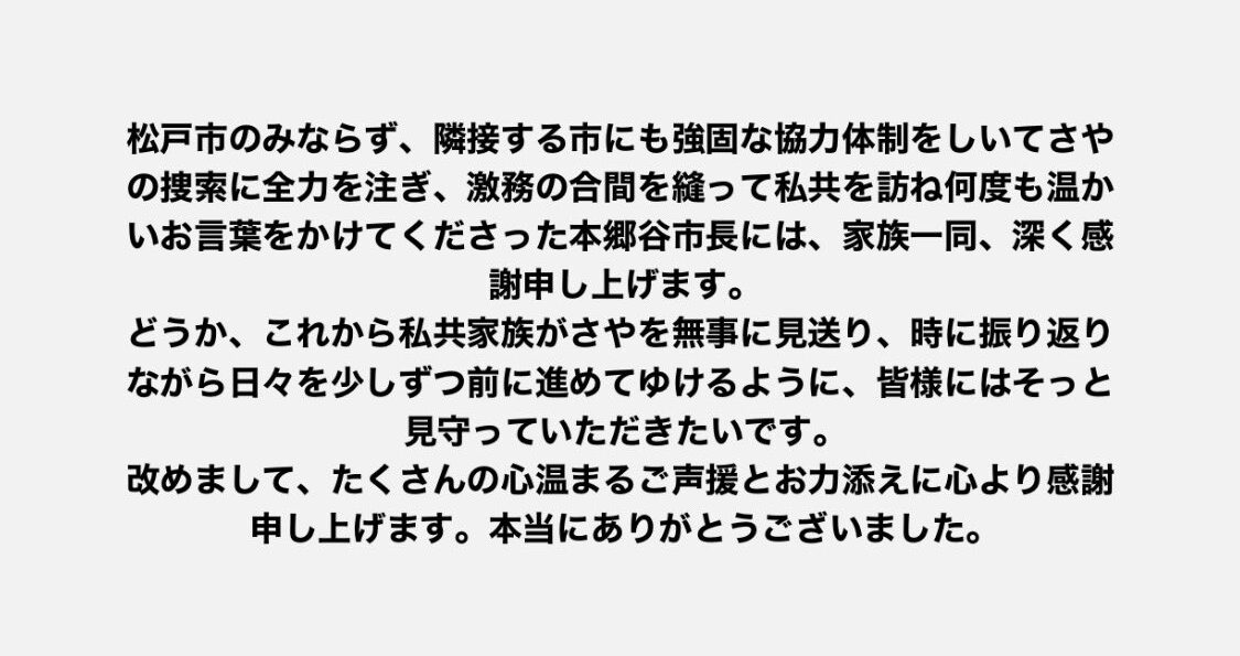 さやの捜索にご協力、ご声援いただいていた方々へ心より感謝申し上げます。