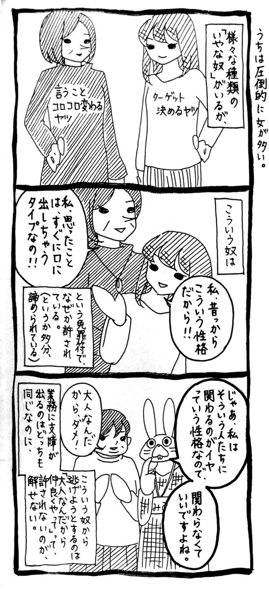 なぜこういうタイプには「大人なんだから職場では口を慎めよ」と言わないのか。言われる側の最終手段は「辞める」しかなくて、辞めてしまった人を何人も見てきたし(うちの職場だけでなくね)、社会における究極の理不尽だなって感じた。…