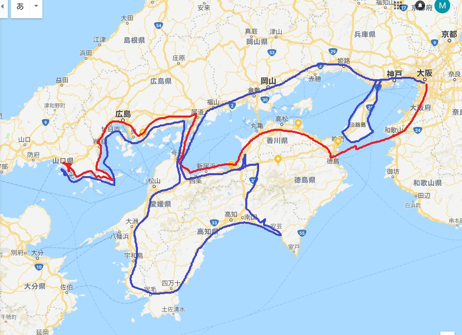 赤:30歳とはいえ、拘置されて自転車の練習なんてしてないし盗んだクロスバイクでろくに整備せずに走れるルートとかコンナ感じかな(舐めプ) 青:実際の根性入った逃走犯が辿ったルート(自転車乗りの夢が詰まったかのような瀬戸内&…