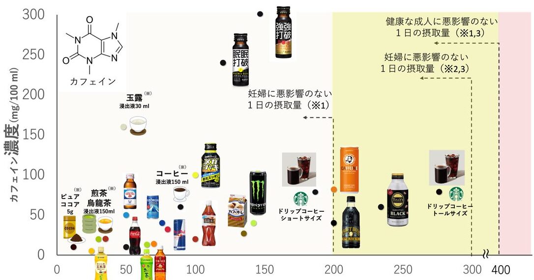 長文 いろんな飲み物のカフェインを濃度と量でマッピングするとこうなる