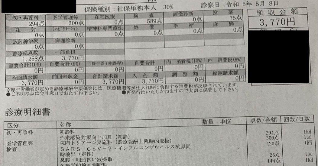 どうも、5類移行当日に抗原検査で陽性判定を受けたマヌケです。せめて人柱になればと思って、5類移行で診察代と薬代がいくらになったかアップしておきます。詳しくないのでこれが妥当不当の議論をするつもりはありません。ただ参考になればと思います。症状...
