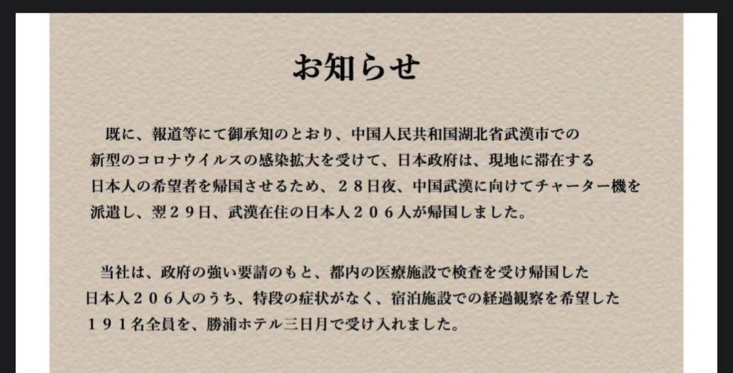 【報道にある武漢市からの一時帰国者受け入れについて】 pic.twitter.com/6o51gPhDP1— 勝浦ホテル三日月 (@mikazuki_katsu) 2020年1月31日幹部だけで対応にあたっているとお伺いした。脱帽— 外山康...