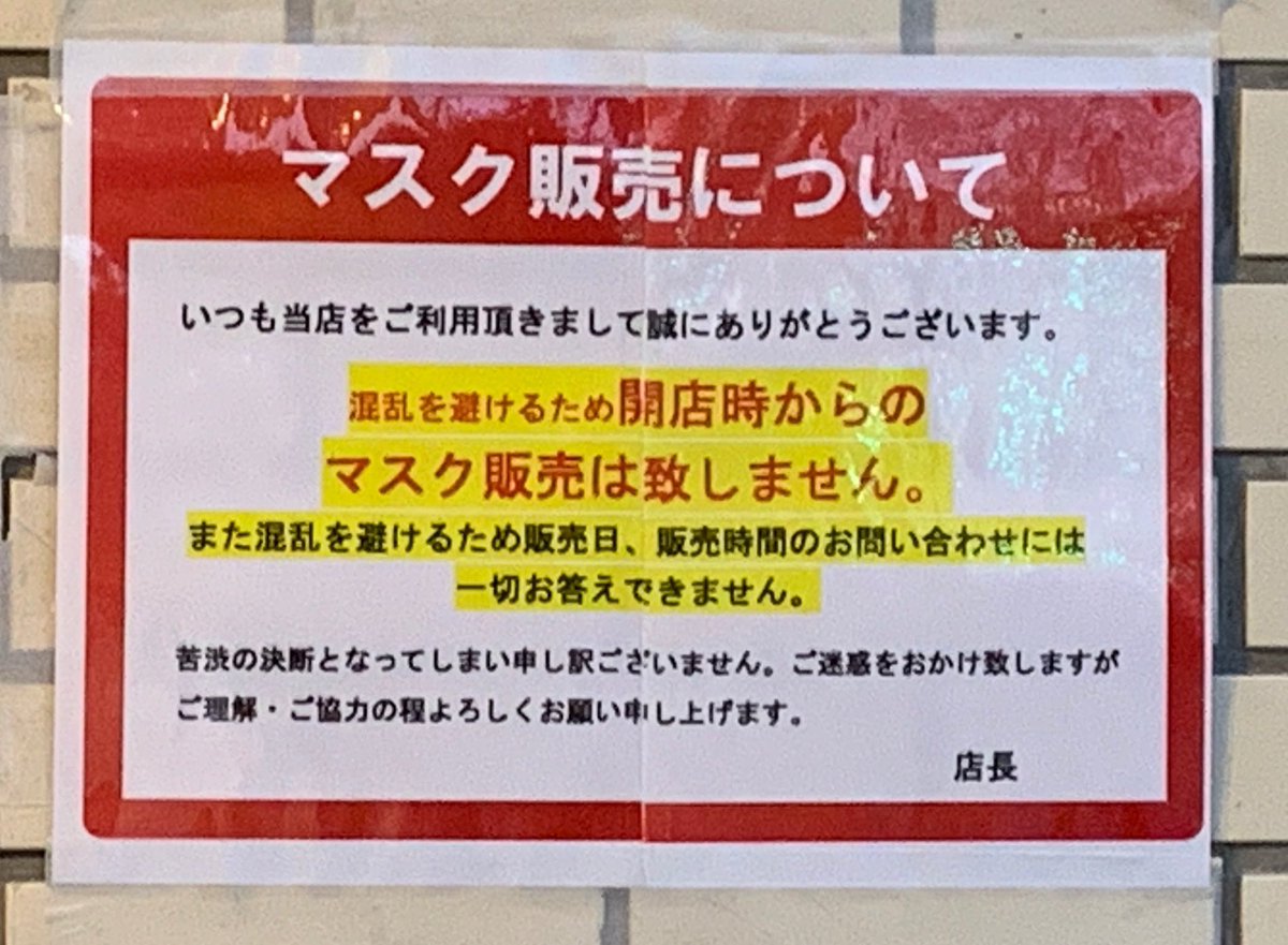 近所のドラッグストアがマスク購入を完全予約制になった!身分証見せたら整理券くれて「20?40番の方購入頂けます」って張り紙出るから店入らず確認出来るし毎日買う人いなくなるし最高!店員さんも楽そうだし!— ガナドウ (@gana_dou) 2...