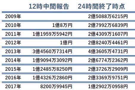 24hTVの募金額2019年 684,212,104円 ←嵐がパーソナリティ2018年 267,875,910円2017年 129,020,958円2016年 233,699,751円2015年 237,262,909円2014年 267,...