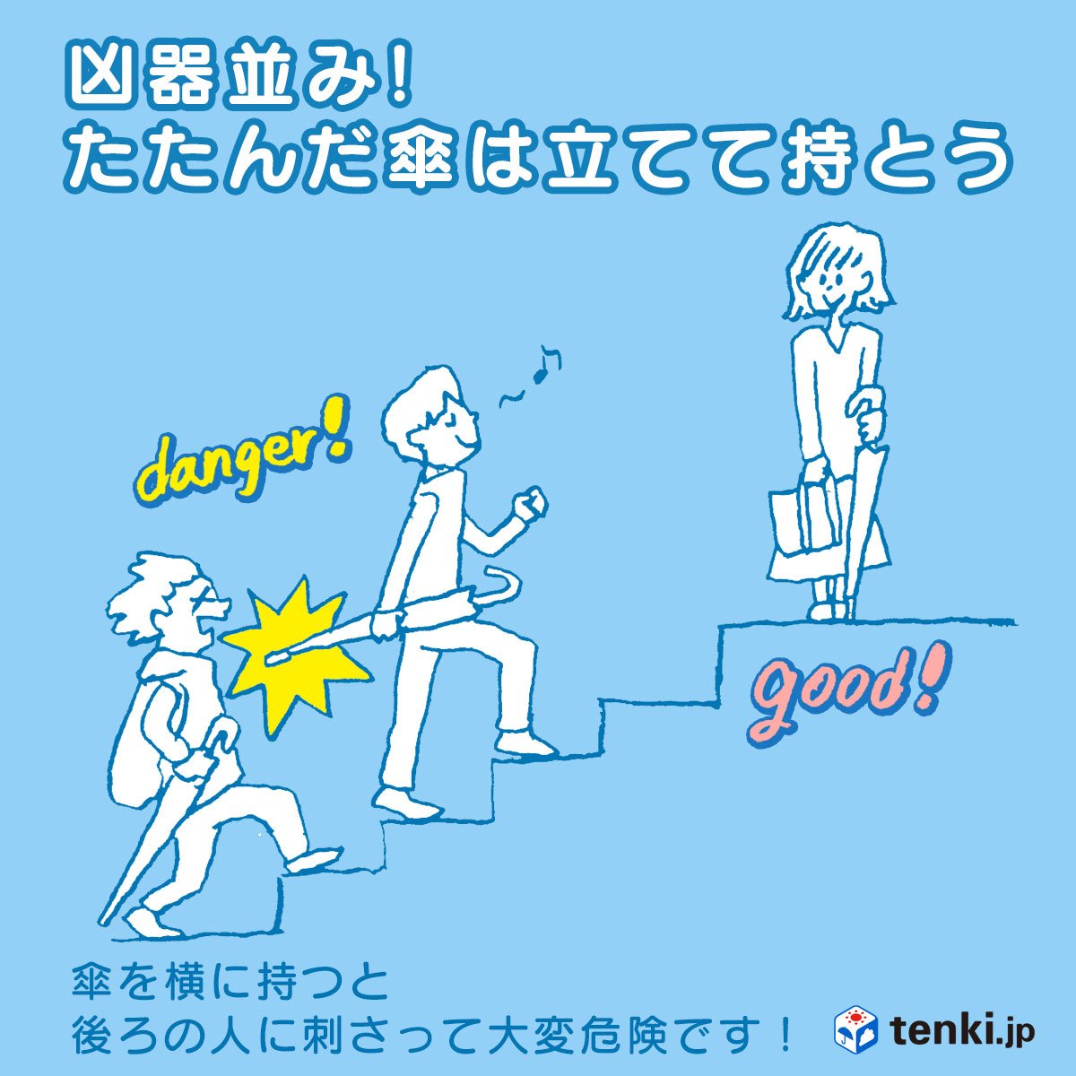 【雨の日マナー】凶器並み!たたんだ傘は立てて持とう。 関東では大雨のピークを越えましたが…本日6月11日は「#傘の日」。お帰りの際は、少しだけ手元の傘を意識してみてくださいね??#雨の日マナー pic.twitter.com/AbPGcdp...