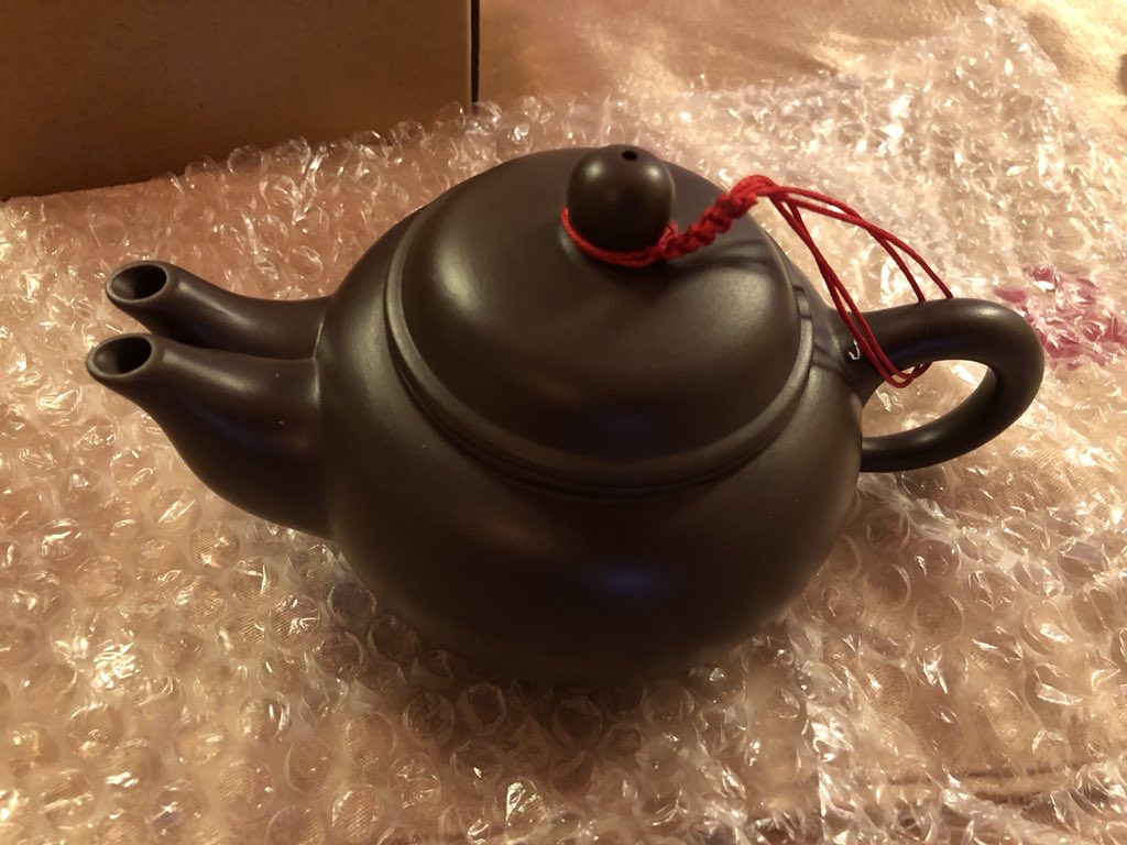 台湾のお茶屋さんで埃を被った二口の急須を発見し購入。しかし店員さんは「まさかこれが売れるとは……」という表情だったので、英語で「この二口には何の意味があるんですか?」と尋ねると、お茶を注ぐジェスチャーと共に日本語で一言。「はやい」 pic....