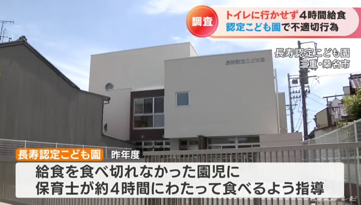 【悲報】給食を残した園児さん、残さず食べるよう4時間迫られ失禁■『長寿認定こども園』@三重県桑名市・給食を残した園児を約4時間にわたって食べるよう指導→トイレに行けず失禁・保護者が市に相談→市の聞き取り調査で園が事実と認める・他に虐待がなか...