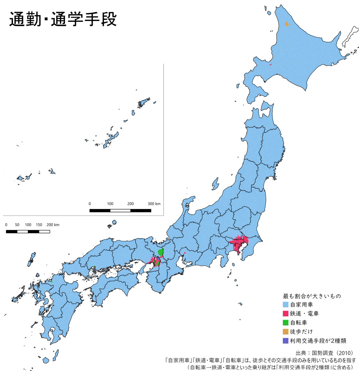 日本のそれぞれの地域でどんな交通手段が使われているかを地図にしてみました。通勤・通学手段のうち、最も多く利用されているもの市区町村単位で表示しています。 #地図で見る日本 pic.twitter.com/FMYtHChFqr— 永太郎(なが...