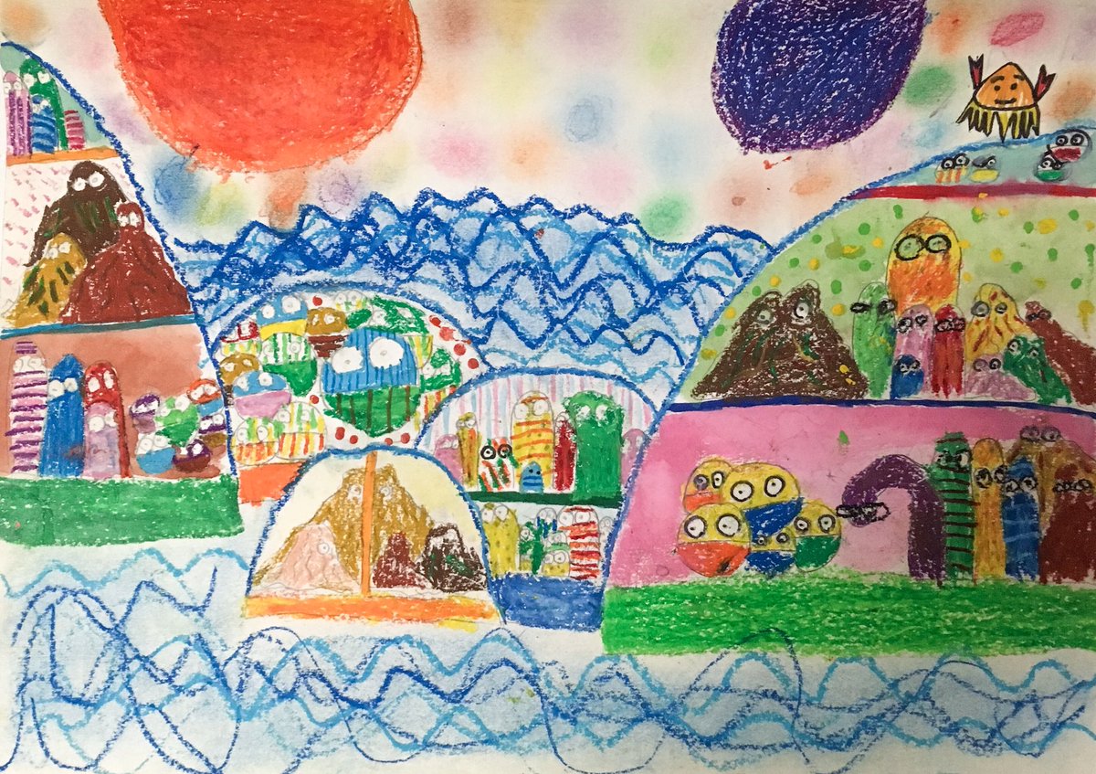 夫が小4の時に描いた「未来の僕の街」なんですけど、「二つの太陽が輝き海面が上昇した世界で、巨大シェルターに身を寄せ合い暮らすのは人の形を保てなくなった埼玉県民達」というあらすじがヤバくて実家来る度爆笑してしまう pic.twitter.co...
