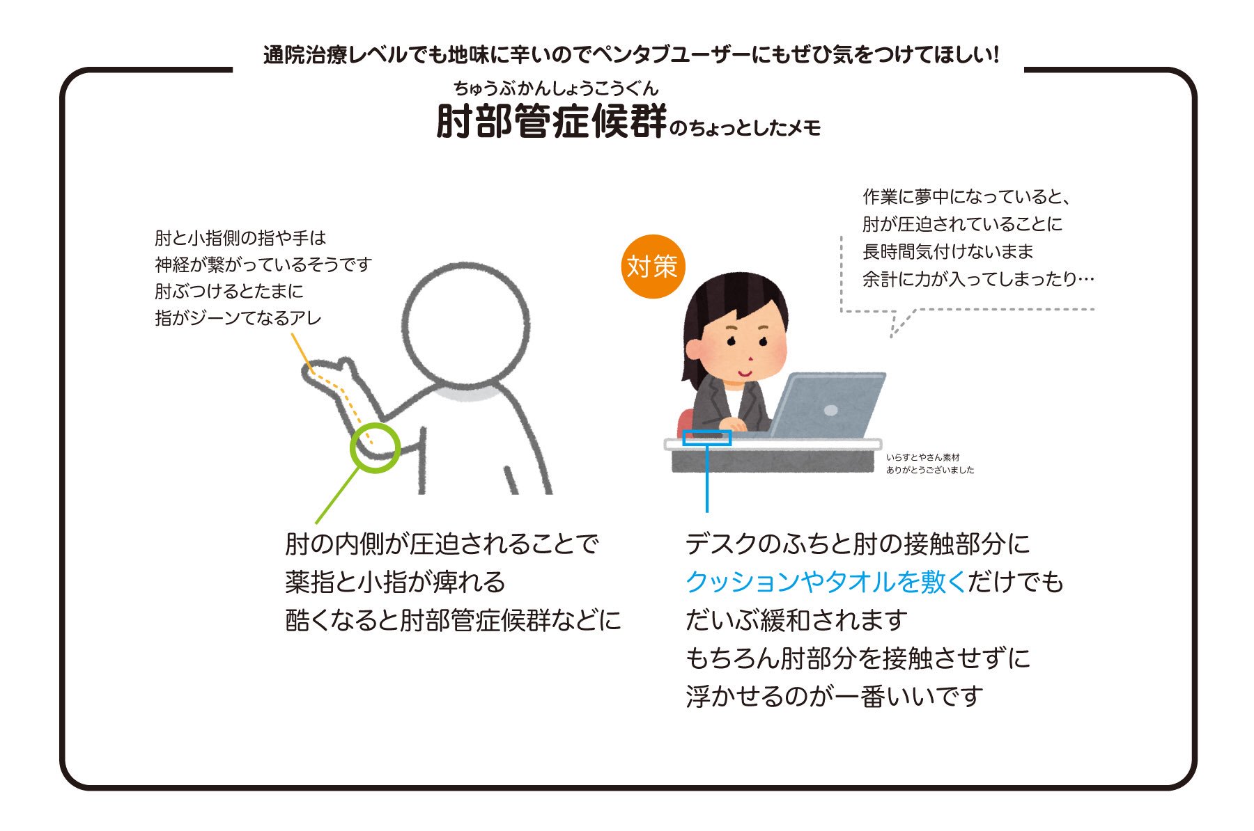 ツイッター 仕事中に突然指が痺れてペンを握れなくなり病院に行ったら この間絵描きの友人にも話したんですが、過去仕事中に突然指が痺れてペンを握れなくなり病院に行ったら肘部管症候群、指や手ではなくPC作業中デスクの縁に置いた肘が圧迫されていたことが原因でした。ペンタブを常用している方は利き手側の肘下に薄いクッシ... 2017.11.12 ツイッター健康