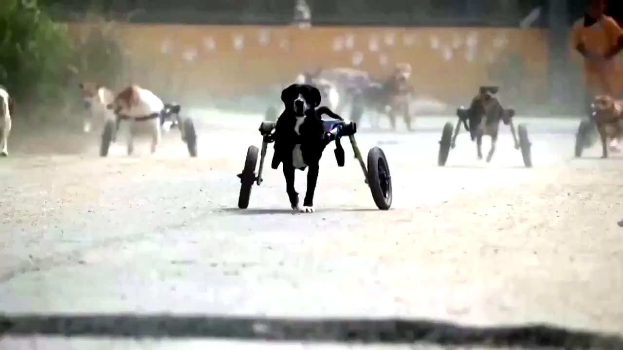短文 動物シェルターに犬用車椅子が寄贈され四肢に障害のある犬が元気に走り回っている