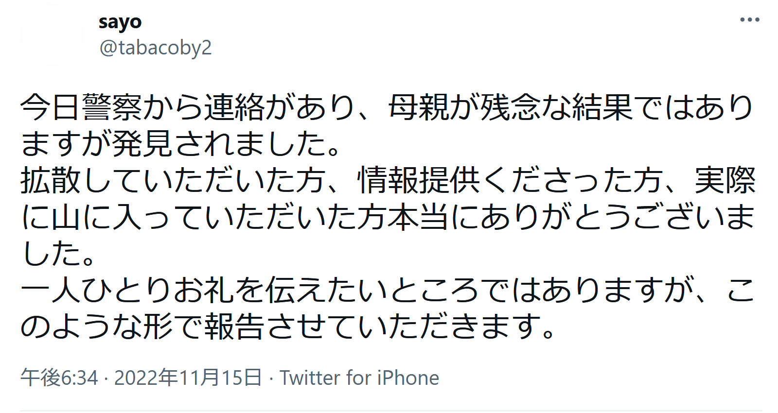 ツイッター 警察から連絡があり、母親が残念な結果ではありますが発見されました