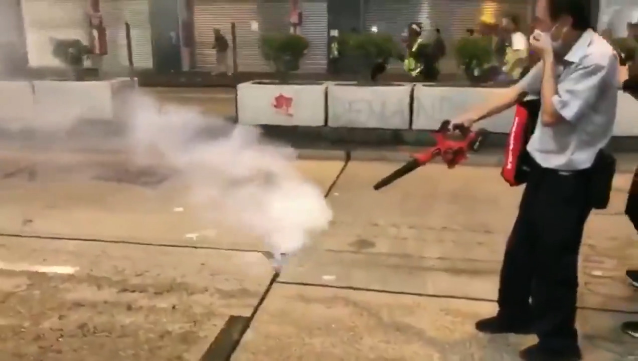 First time ever #HongKongProtesters have used a leaf blower to tackle tear gas. Clearly a new tactic unlocked. pic.twitt...