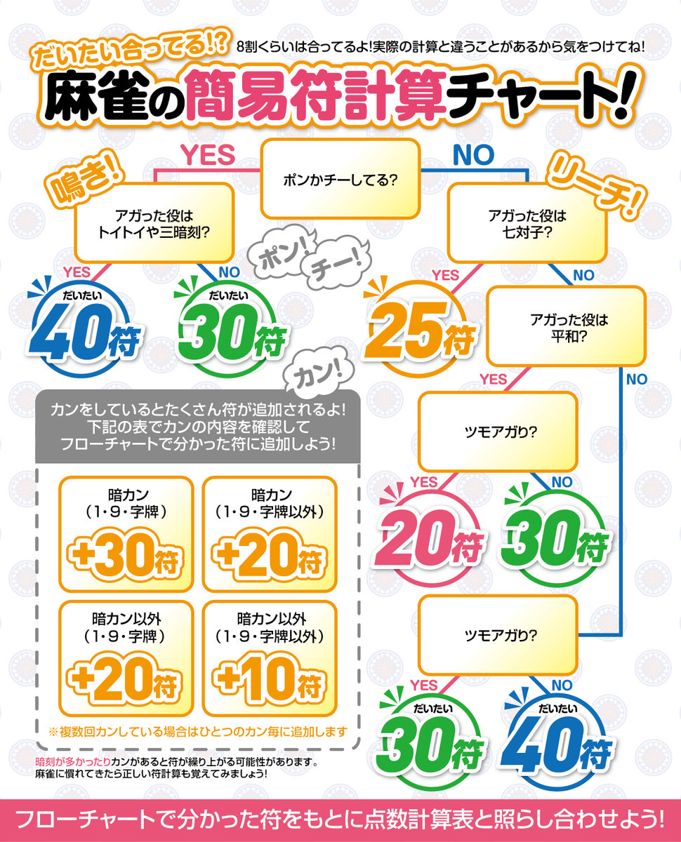 役は分かるけど点数計算は…という人のための簡易符計算チャートを作りました!符計算って難しそうだと思っちゃうかもしれないけど、こんなチャートでもだいたい補えるくらいなんだよ!さらに興味が出ればちゃんと符計算を覚えてみるのもいいし、そんな人の低...